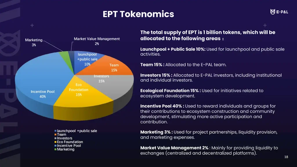 إجمالي المعروض من توكنات EPT هو 1 مليار توكن، وتم توزيعها على النحو التالي:
