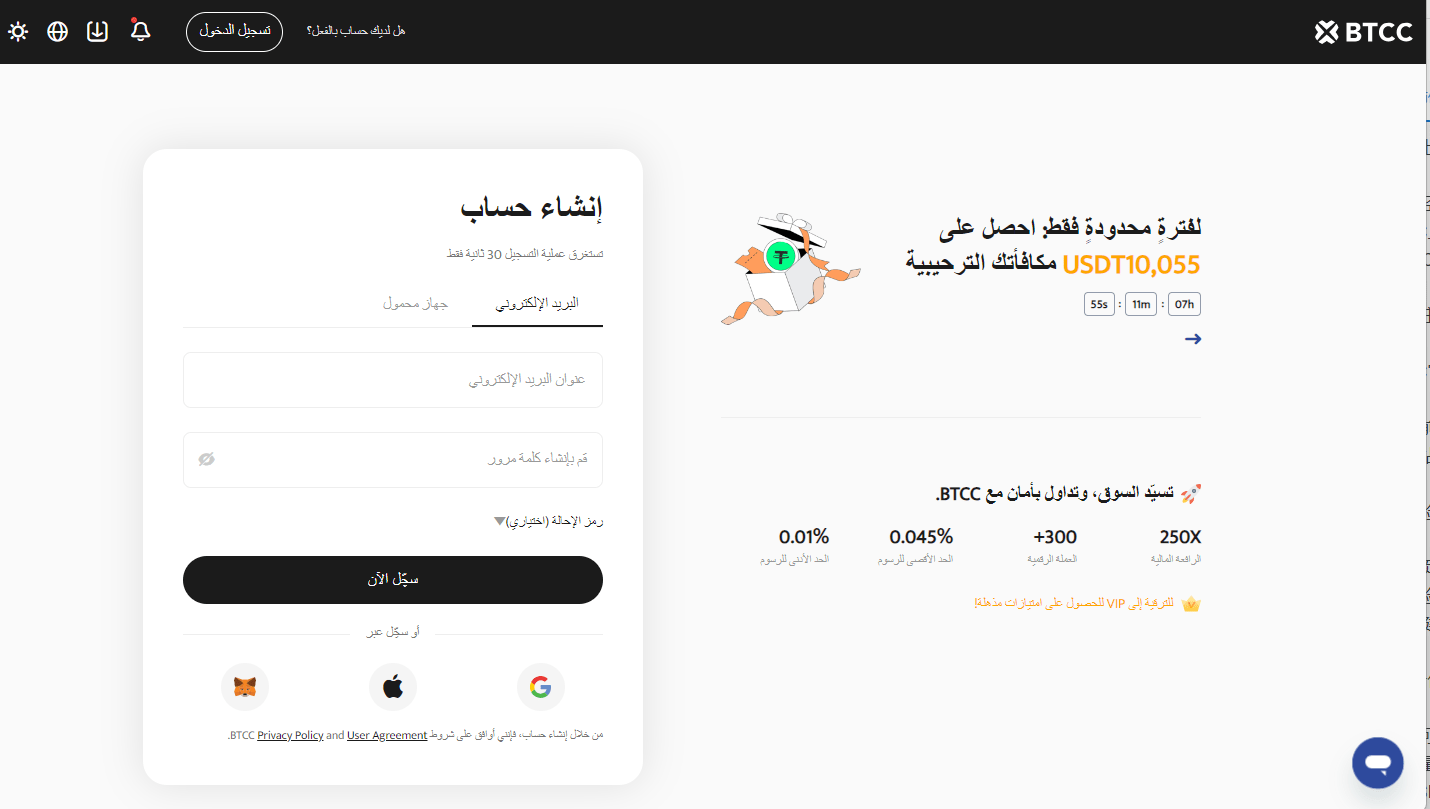 إذا كنت مهتمًا بالبدء، يمكنك التسجيل الآن على منصة BTCC والانطلاق في رحلتك الاستثمارية بثقة.حاليًا، عند التسجيل في BTCC ستحصل على مكافأة فورية بقيمة 10 USDT. كما يمكن للمستخدمين الجدد الذين يودعون خلال 7 أيام من التسجيل الحصول على مكافآت تصل إلى 10,055 USDT!
