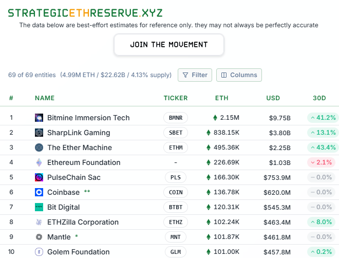 كما أن الاهتمام المؤسسي المتزايد ودور الخزائن الاستثمارية يدعمان السرد حول تراكم الإيثريوم. وقد كشفت شركة BitMine عن امتلاكها مخزونًا كبيرًا من ETH بقيمة تقارب 10 مليارات دولار (ما يعادل حوالي 1.8% من إجمالي المعروض).