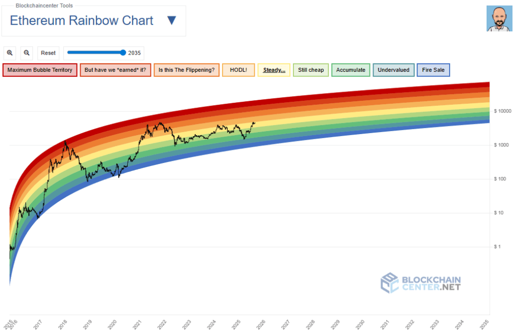 كما يُظهر مخطط قوس الإيثريوم (Ethereum Rainbow Chart) — وهو نموذج لوغاريتمي يستخدم لتقدير معنويات السوق — نطاقًا محتملًا واسعًا للسعر بين 764 و22,164 دولارًا، ما يمنح المستثمرين مؤشرًا على نقاط الدخول الاستثمارية المحتملة وفق مستويات الثقة في السوق.