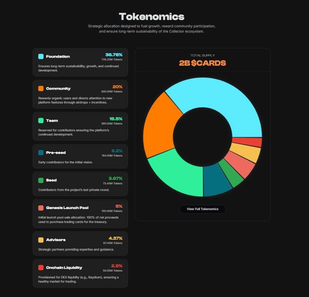 In August 2025, Collector Crypt announced the launch of the $CARDS TGE via Metaplex Genesis. The presale took place from 27 to 29 August 2025, offering 100 million $CARDS (5% of the total supply), with time-tiered bonuses designed to encourage early participation. All net proceeds from the presale are allocated towards acquiring additional RWA Pokémon cards, thereby further growing the liquidity pool.