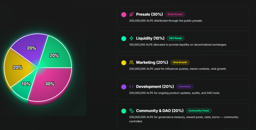 AlphaPepe has launched a presale for its $ALPE token. According to the tokenomics, 30% of the total supply has been allocated to presale buyers. The AlphaPepe presale is ongoing and is attracting consistent global participation from investors seeking early access to one of the year’s fastest-growing meme coin projects.