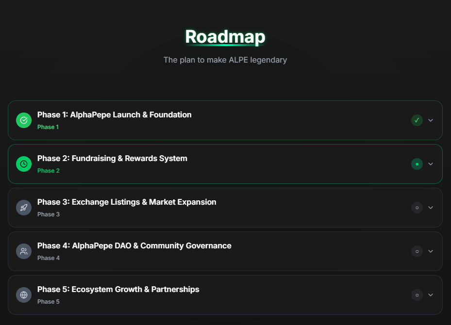 | Phase One: AlphaPepe Launch & Foundation | Phase Two: Fundraising & Rewards System | Phase Three: Exchange Listings & Market Expansion | Phase Four: AlphaPepe DAO & Community Governance | Phase Five: Ecosystem Growth & Partnerships |