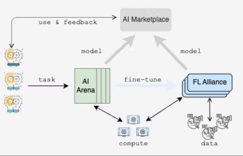 FLock.io’s system design integrates decentralized AI model creation, training, and deployment into a streamlined ecosystem. The system comprises three major components: AI Arena, FL Alliance, and AI Marketplace.