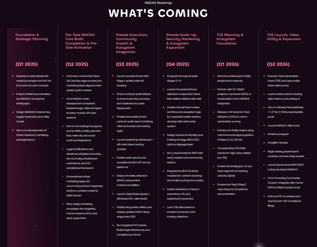 - Community-Driven Ecosystem: MAGAX has placed a strong emphasis on building a community-first ecosystem. Holders will influence governance decisions, ensuring the project evolves according to the interests of its supporters. Its roadmap includes staking, buybacks, partnerships with meme creators, and integrations with social platforms. By embedding itself within the digital culture economy, MAGAX is positioning itself as more than just a speculative token. This community focus mirrors SHIB’s success while adding layers of innovation that could sustain growth.