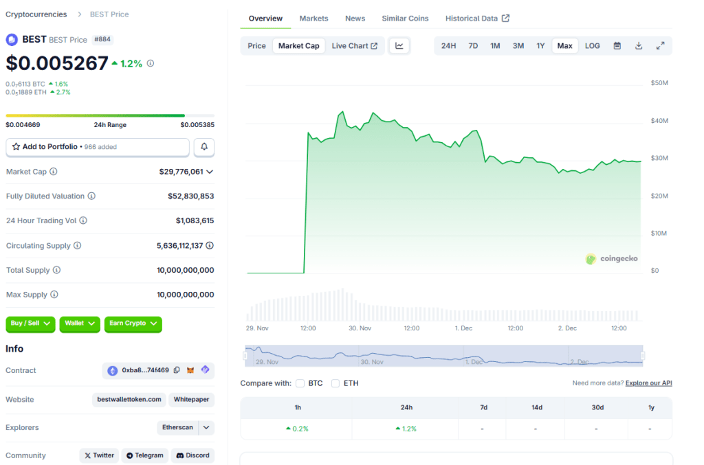 As of writing the article, BEST coin is traded at $0.0052, boasting a market cap of $29.7M, and witnessing a 24-hour trading volume of $1.08M. BEST Token saw a 24-hour change of +1.2%, with minor fluctuations of +0.2%% in the past hour.