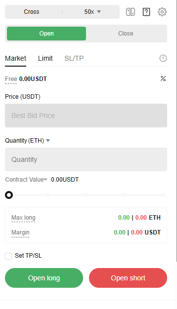 Then, choose the contract trading order type. Futures contract orders on BTCC platform include market orders, limit orders and SL/TP orders.