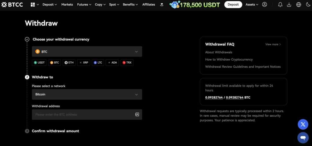 Crypto withdrawals on the BTCC exchange are quick and effortless. Simply click “Withdraw”, select your desired digital asset and network, enter the amount, paste your receiving wallet address, and confirm the transaction using your enabled security method (such as two-factor authentication).