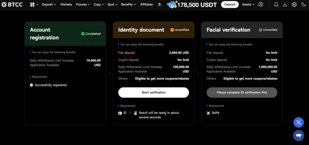 Indeed. Before using BTCC goods, users must finish the Know Your Customer (KYC) process. A facial recognition scan and legitimate identification documents must be submitted for this process. Usually, it is finished in a few minutes. This procedure has the benefit of strengthening the security of the exchange and satisfying legal requirements.