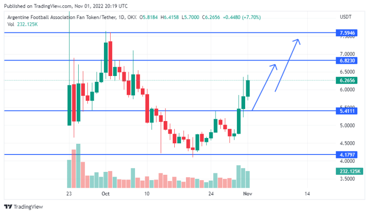 With a weekly increase of nearly 8% at $6.27 per token, the Argentine Football Association Fan Token (ARG) is one of the best-performing fan tokens. CoinMarketCap places it at #543 in terms of 24-hour trading volume, with $4 million. With a total of 20,000,000 ARG coins available, only 3,746,912 are now in circulation. For those in search of high returns in the near term, the Fan tokens introduce a novel asset class.