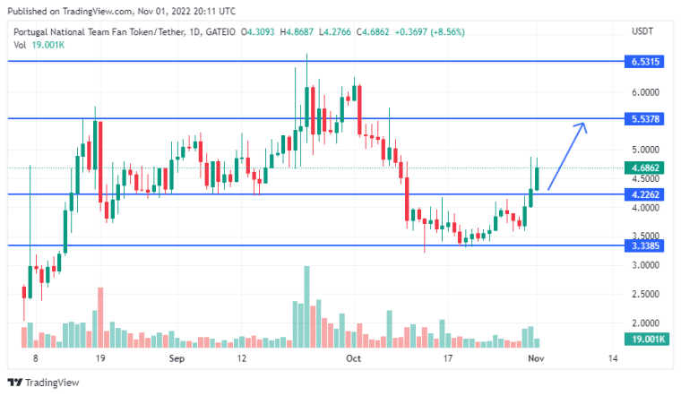 At present, one Portugal National Team Fan Token is worth $4.69, and $6 million has changed hands in the last 24 hours. The price of the Portugal National Team Fan Token has risen by more than 8% in the past 24 hours and more than 22% in the past 7 days. A current market cap of $14 million places CoinMarketCap at position #654 on CoinMarketCap. There are a total of 3,180,799 POR coins in circulation.