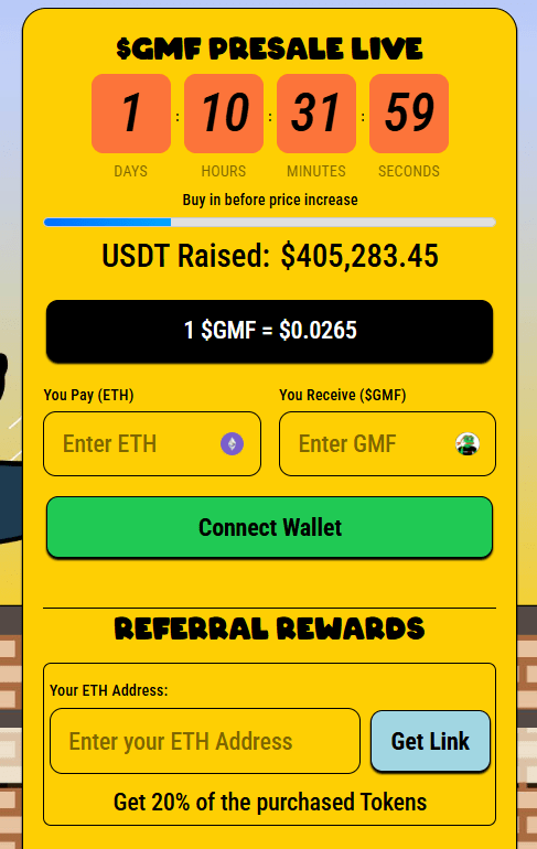 During the presale stage, interested investors can purchase $GMF using various currencies and blockchains; simply connect your wallet to the presale widget.