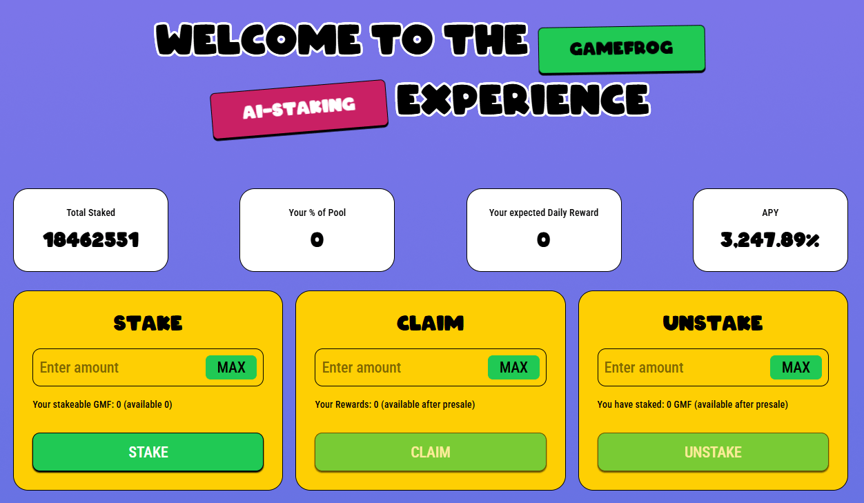 GameFrog ($GMF) is a meme coin that combines community engagement with algorithmic market optimization, drawing inspiration from GameStop and the Pepe the Frog meme. In a financial landscape often dominated by centralized institutions, GameFrog leverages decentralized finance (DeFi) technology to democratize financial opportunities, making them accessible to everyone. By prioritizing staking and token ownership, the platform empowers users to challenge traditional monetary systems.
