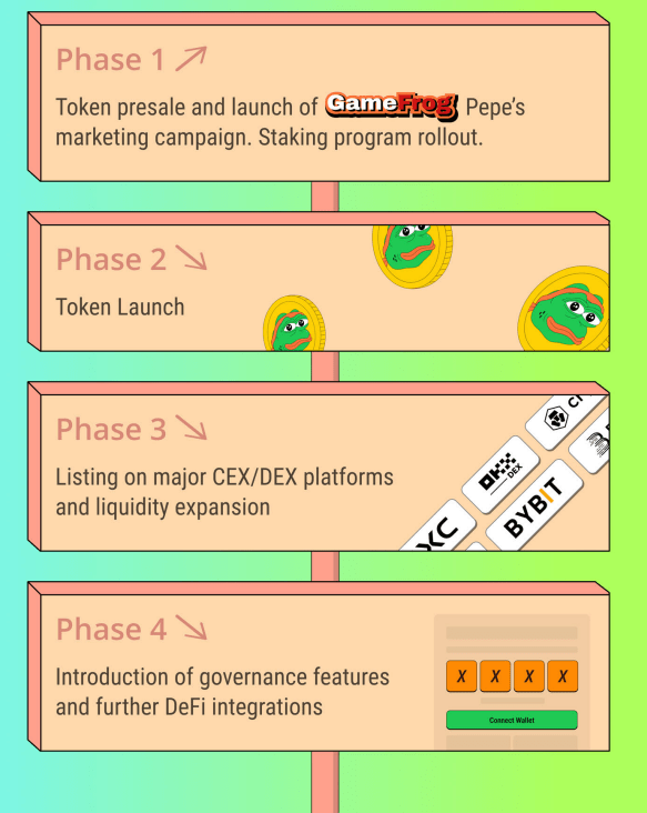| Token presale and launch of Game Pepe’s marketing campaign. Staking program rollout. | Token Launch | Listing on major CEX/DEX platforms and liquidity expansion | Introduction of governance features and further DeFi integrations |