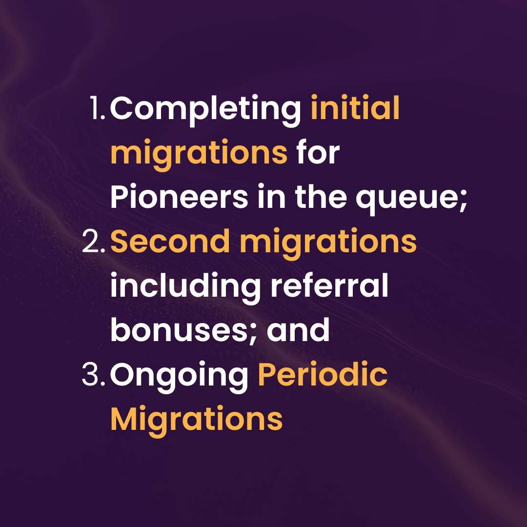 - Premières Migrations : Cette phase consiste à migrer les utilisateurs existants dans la file d’attente, en incluant les récompenses de minage de base vérifiées, les récompenses du Cercle de Sécurité, les récompenses de verrouillage, les récompenses d’utilisation des applications utilitaires et les récompenses des Nœuds confirmés.