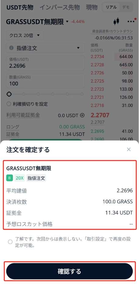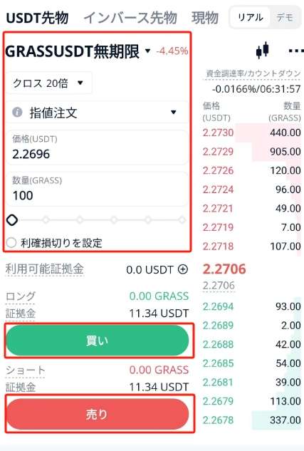 注文価格と注文数量を入力し、取引の方向を選択します。買い注文または売り注文を選択できます。