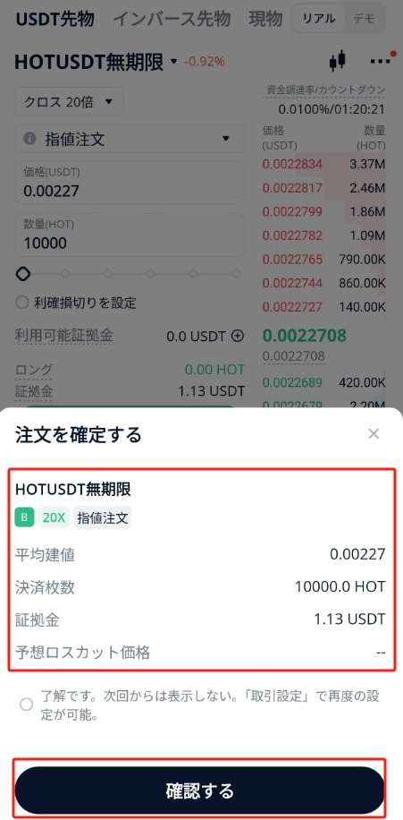 HOTUSDT無期限先物を選択したら、取引パラメータを設定します。先ずは、レバレッジの倍数を選択します。