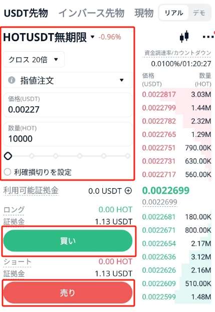 注文価格と注文数量を入力し、取引の方向を選択します。買い注文または売り注文を選択できます。