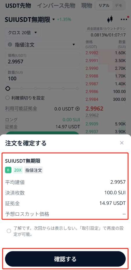 PIUSDT無期限先物(ここはSuiを例にする)を選択したら、取引パラメータを設定します。先ずは、レバレッジの倍数を選択します。