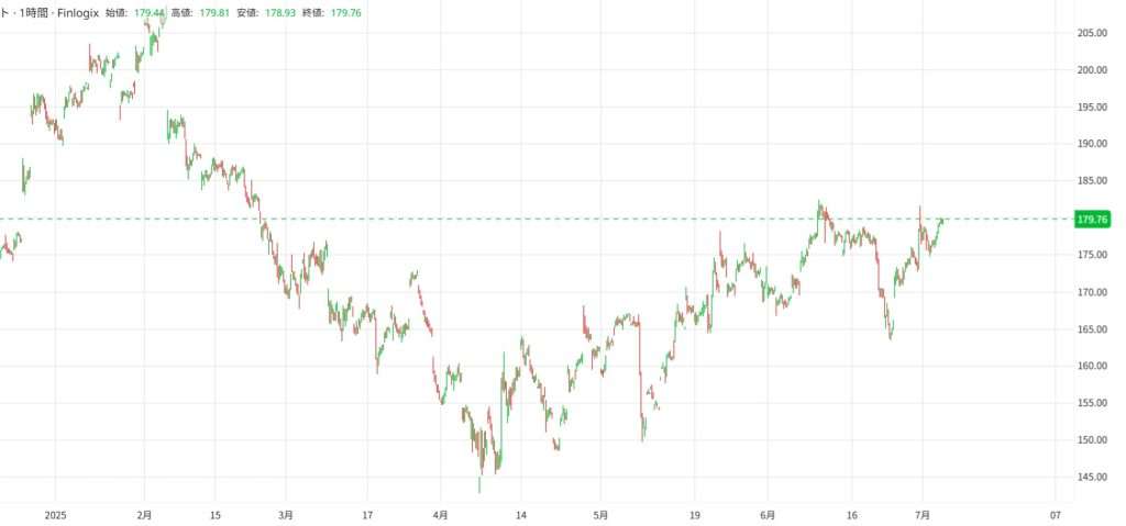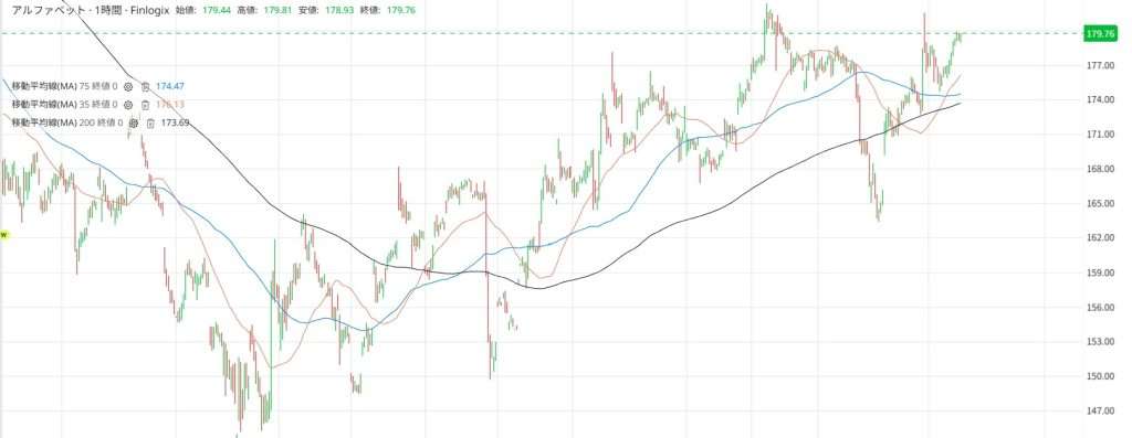 確かに様々なリスク要因はありますが、現在のチャートの動向を見る限りでは2025年7月のアルファベットの株価は上昇トレンドに入っているので、このまま株価が上がる可能性が高いです。