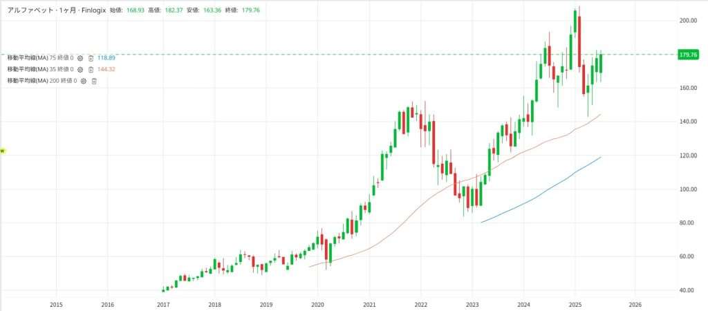 上昇トレンドは現在も継続しているようですので、今回は2025年7月のアルファベットの株価が上場するという予測を前提にまずは長期視点での相場の動向を解説します。