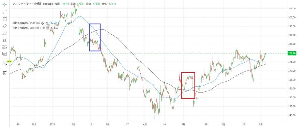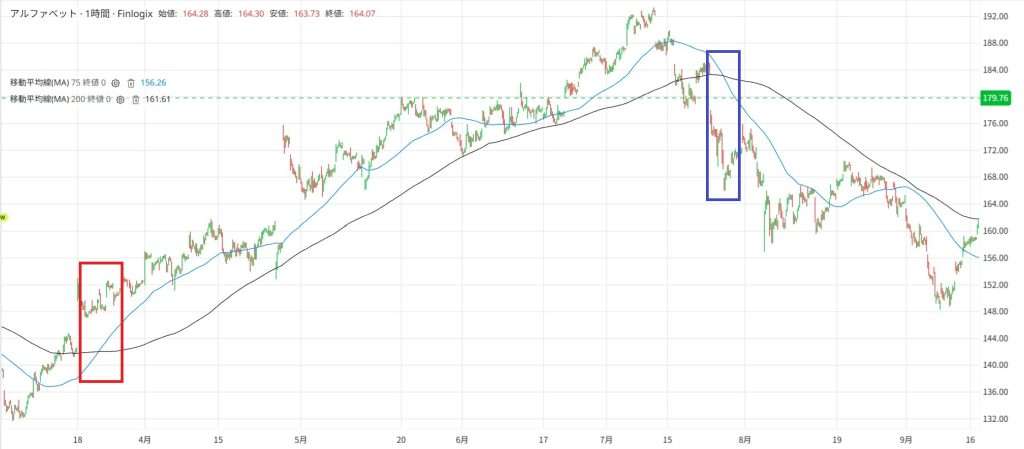例えば1時間足チャートでゴールデンクロス発生のタイミングでアルファベット株を購入し、デッドクロス発生のタイミングで売却をすると以下の画像のようになります。
