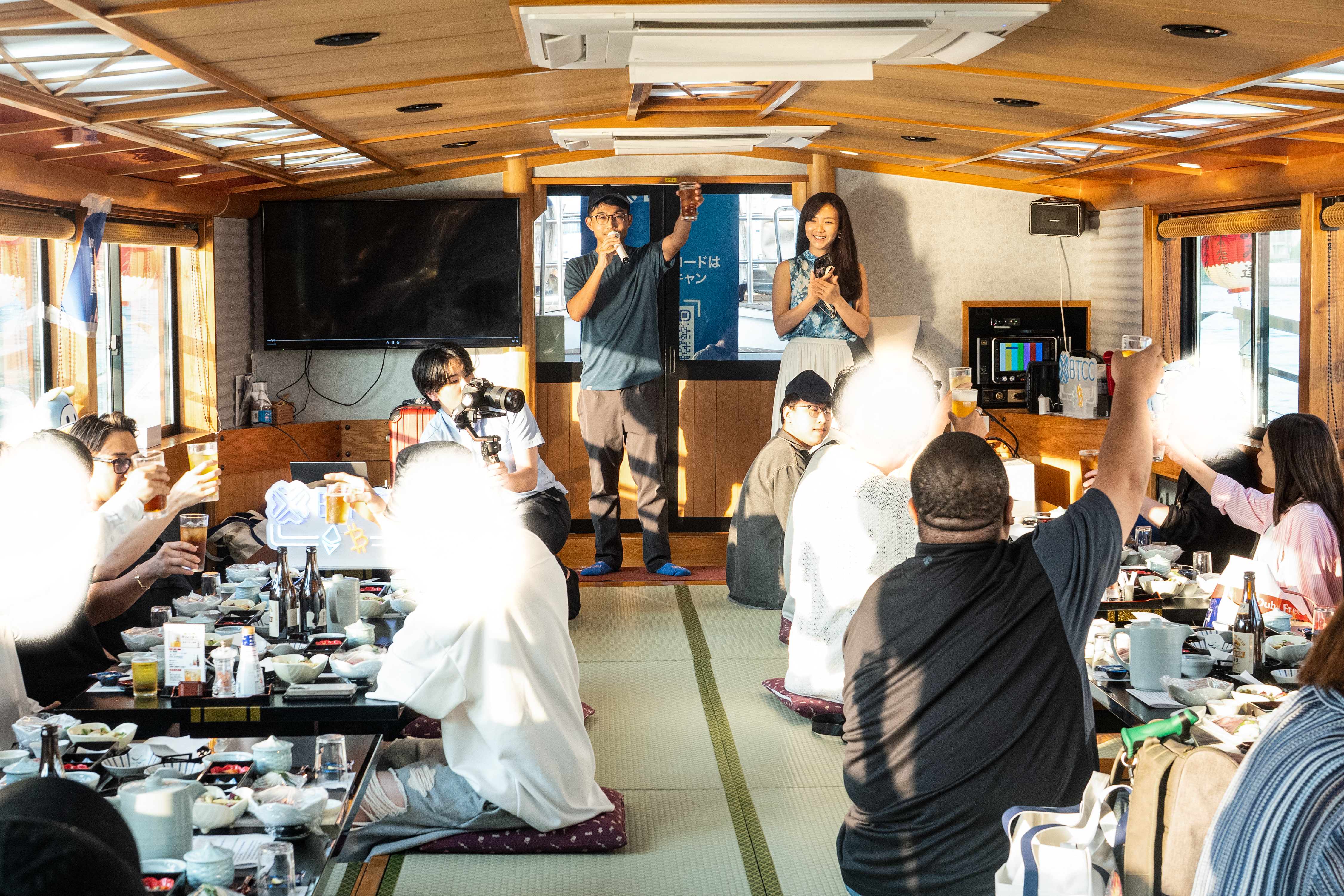 当イベントは東京湾の伝統的な屋形船で行われ、参加者はお台場、レインボーブリッジ、東京スカイツリーといったランドマークを巡る2時間半のクルーズを楽しみました。ゲストには、プロの寿司職人による炙り寿司や和牛寿司が振る舞われ、飲み放題のドリンクとともに活気あふれる交流の場が提供されました。