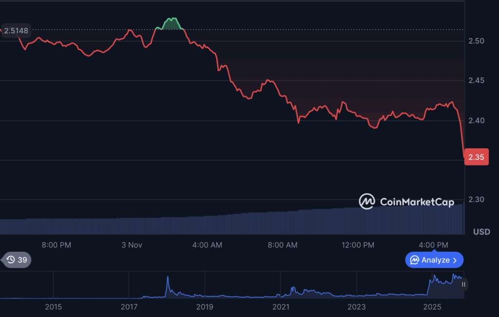 На момент написания XRP торгуется около $2,35, отражая скромное ночное снижение примерно на 6%.