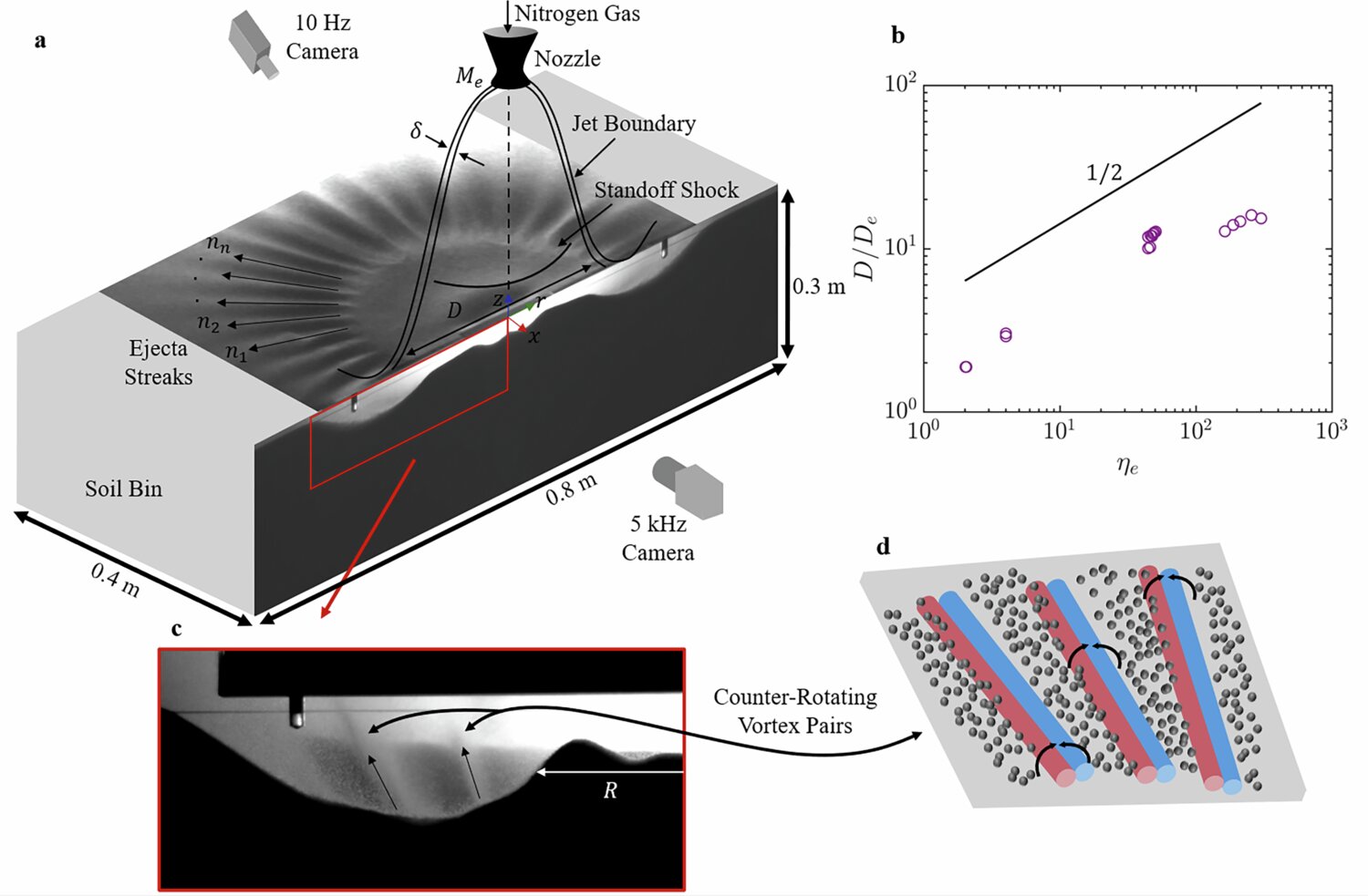 Команда застосувала шестикамерну систему для фільмування експериментів із газовим струменем над імітацією місячного ґрунту. Це дозволило відстежити, як утворюються кратери, і як дрібні частинки ґрунту прискорюються та поширюються від посадкової зони.