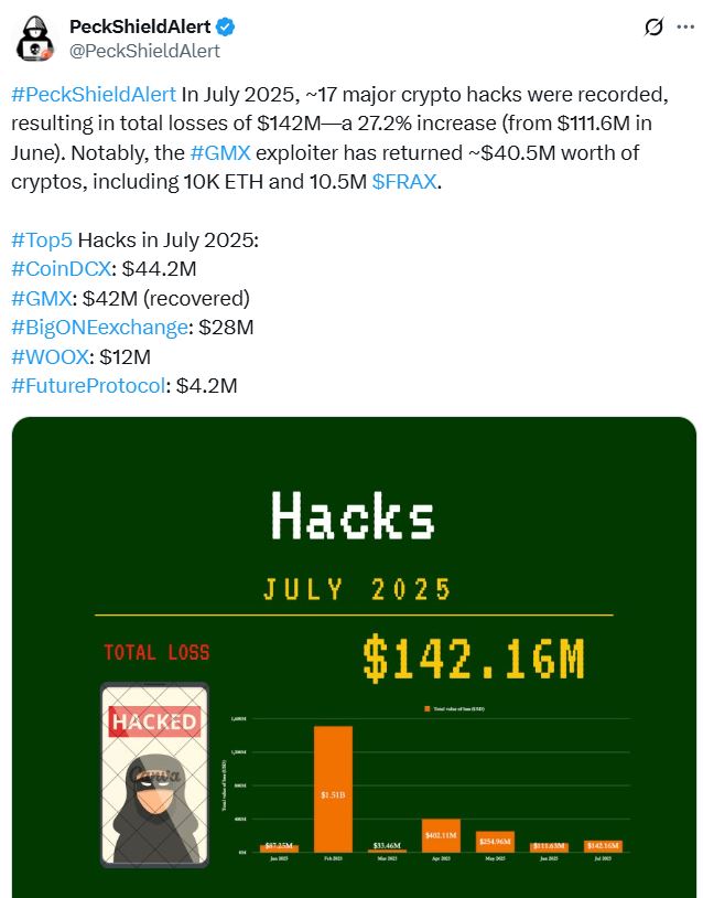 Децентрализованные финансы снова под ударом. Июль 2025 года вошел в историю как месяц рекордных криптокражей — злоумышленники вывели $142 млн цифровых активов.