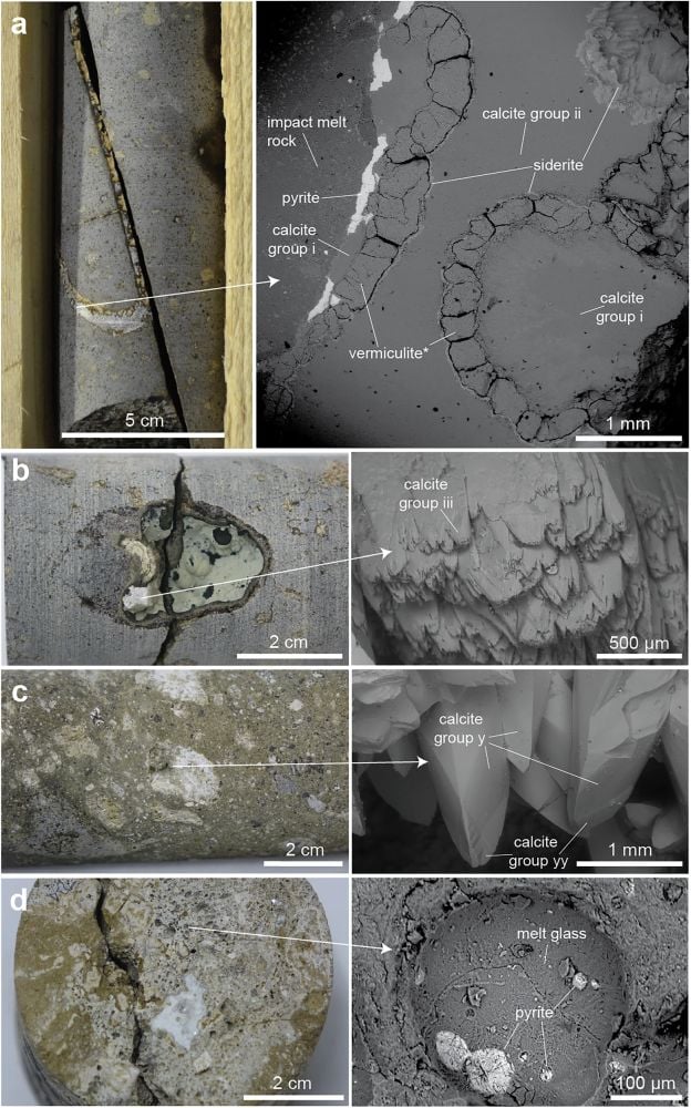 Біосигнатури, виявлені дослідниками. Особливий інтерес представляє пірит. Пірит з виснаженим вмістом сірки відповідає мікробному відновленню сульфатів. Він утворився приблизно через п’ять мільйонів років після удару, коли гідротермальна система охолола до температур, придатних для життя. Кальцит є ще однією потужною біосигнатурою, яка з’явилася через 10 мільйонів років після удару, що свідчить про те, що мікроби процвітали тут протягом мільйонів років. (Gustafsson et al., Nat. Commun., 2025)