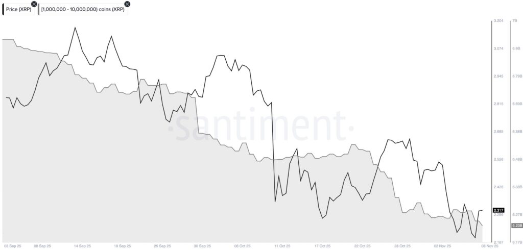 ข้อมูลนี้สอดคล้องกับการเคลื่อนไหวของ “วาฬ” (Whales) โดยกลุ่มที่ถือครอง 1-10 ล้าน XRP ได้ “เทขายเพิ่มอีก 500,000 โทเค็น” ภายใน 48 ชั่วโมงที่ผ่านมา
