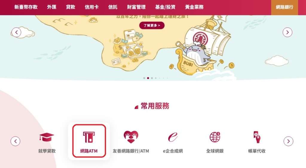 - 前往台灣銀行官網,在常用服務中選擇「網路 ATM」。