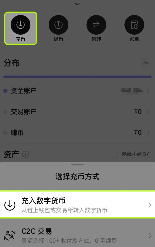 進入 OKX 交易所,點擊「資產」,選擇「充幣」,在幣種列表中選擇 Pi 幣,複製 Pi 幣的充幣地址。