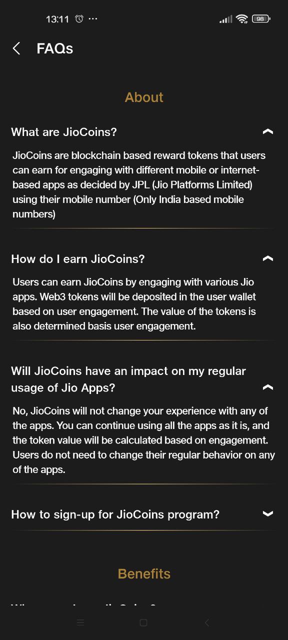 在撰寫本文時,JioCoin是不可轉讓和不可兌換的,但它們可以透過JioSphere平台上的活動獲得,Jio生態系統內 的用戶可以訪問該平台。