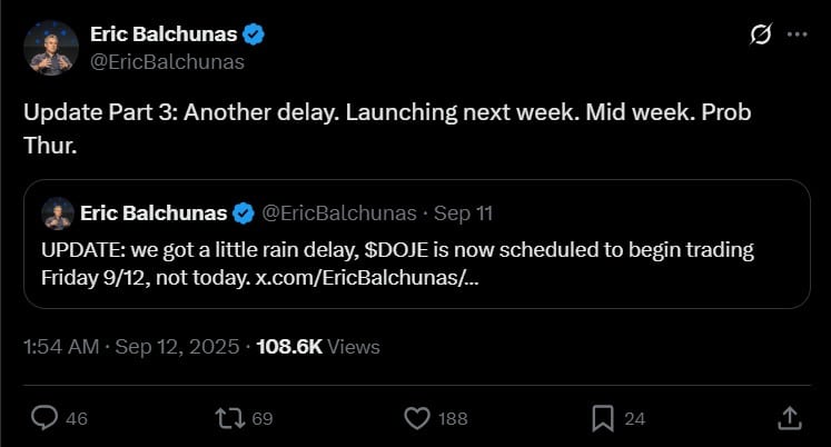 該產品被譽為第一隻讓投資者直接投資全球最受歡迎的 memecoin 的基金,但該產品已經遭遇了幾次延期,彭博社的 Eric Balchunas注意到其發布會已推遲至下週。