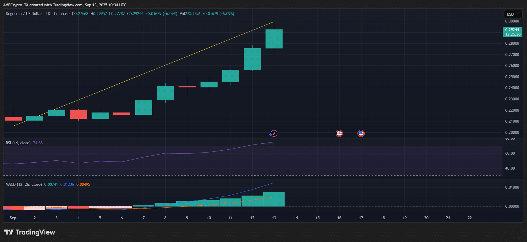 截至發稿時,日線圖呈現上升趨勢,成交量上升,RSI 進入超買區域,MACD 也出現看漲交叉。