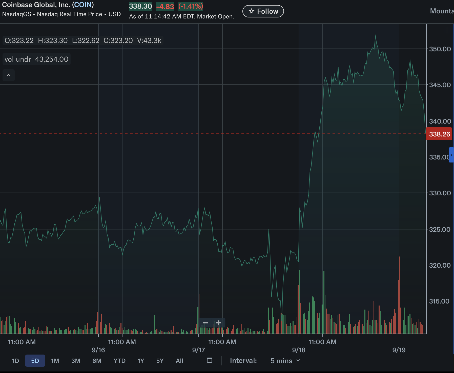 Coinbase 股價從 9 月 18 日接近 322 美元的低點飆升至盤中 349 美元以上的高點,隨後在 9 月 19 日小幅回落至 338 美元左右。 這一走勢是 COIN 數週來最強勁的單日漲幅之一,最高漲幅超過 7%。