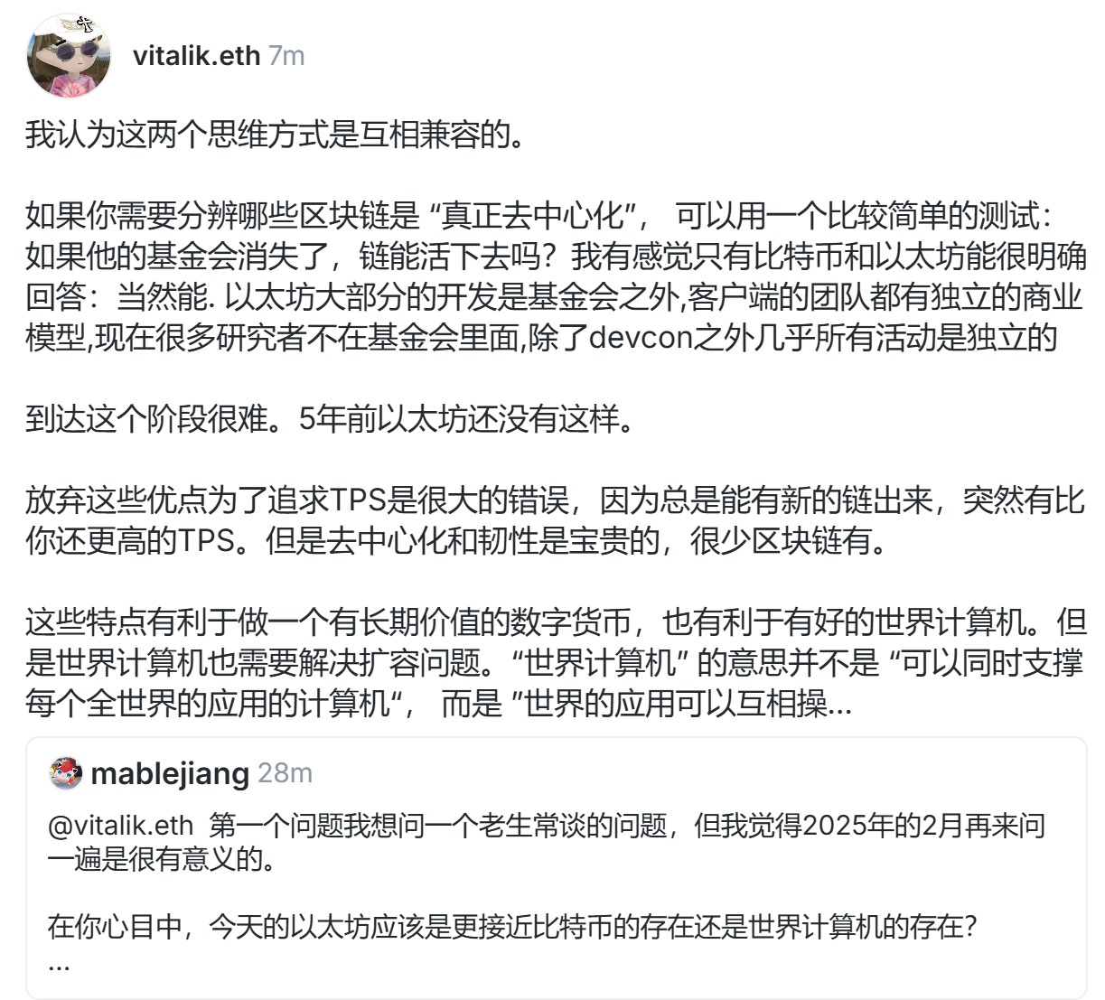深潮TechFlow 消息,2 月19 日,以太坊聯合創始人Vitalik Buterin 發文回應“今天的以太坊應該是更接近比特幣的存在還是世界計算機的存在”問題時表示,判斷區塊鍊是否 真正去中心化的簡單測試是:如果基金會消失,區塊鍊是否能繼續運行。 目前只有比特幣和以太坊能給出明確肯定答案。