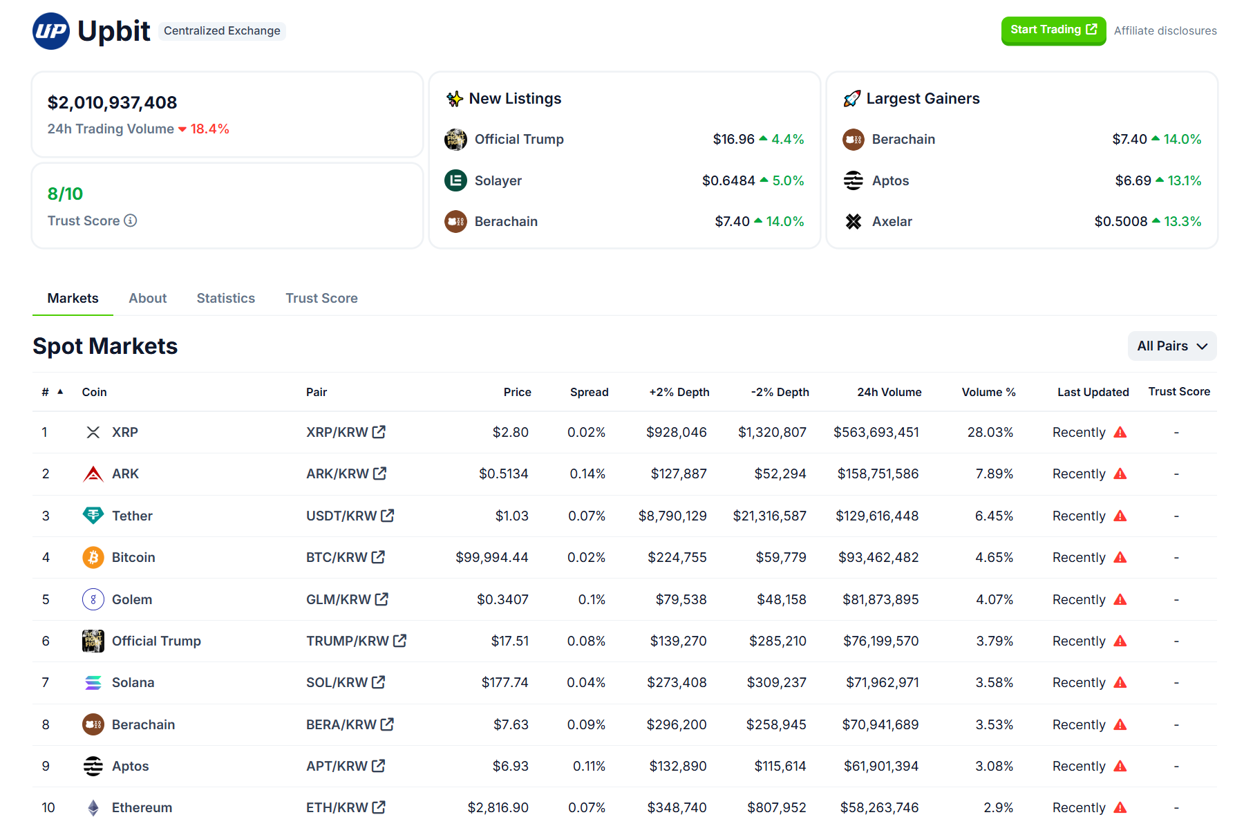 Upbit 24 小時交易量排行:XRP、ARK、USDT 位居前三