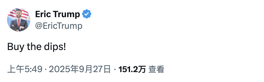 深潮 TechFlow 消息,9 月 27 日,據特朗普次子 Eric TRUMP 於社交平台發文提示抄底:「逢低買入!」。