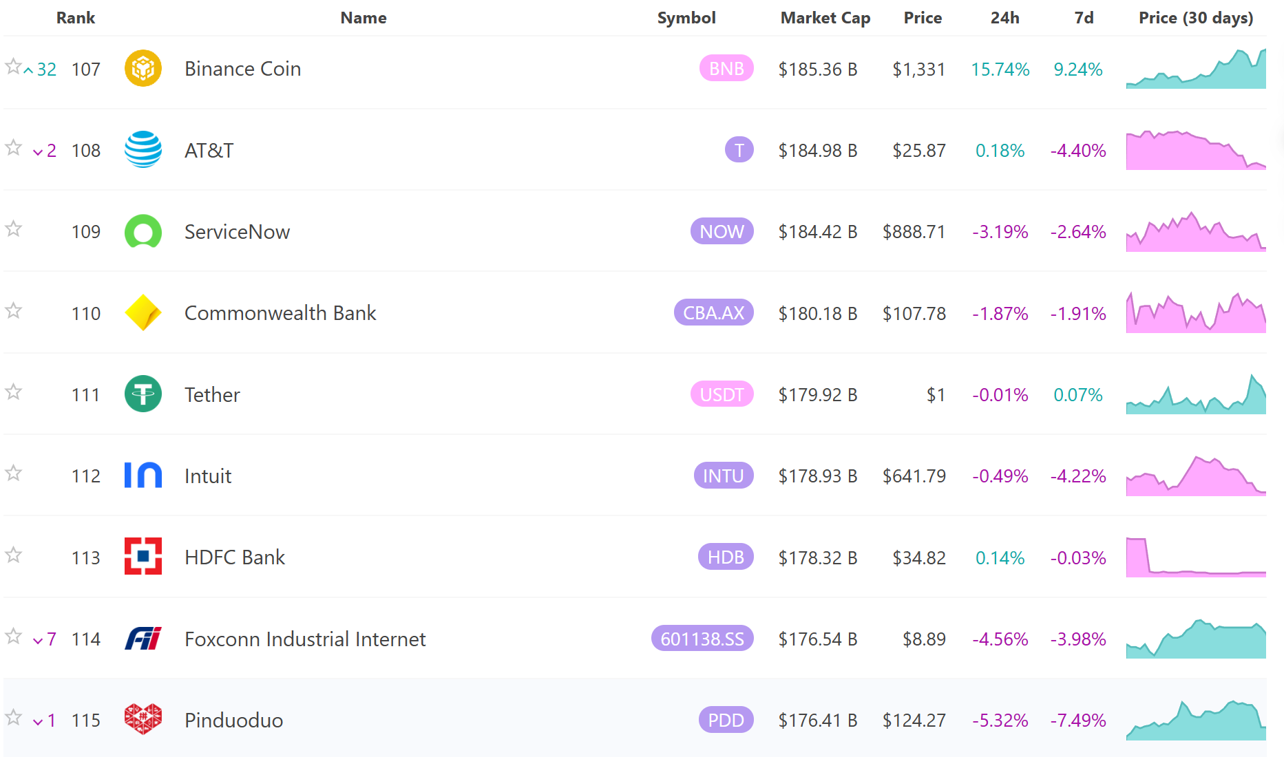 數據:BNB 市值在全球資產市值排名上升 32 位至第 107 位