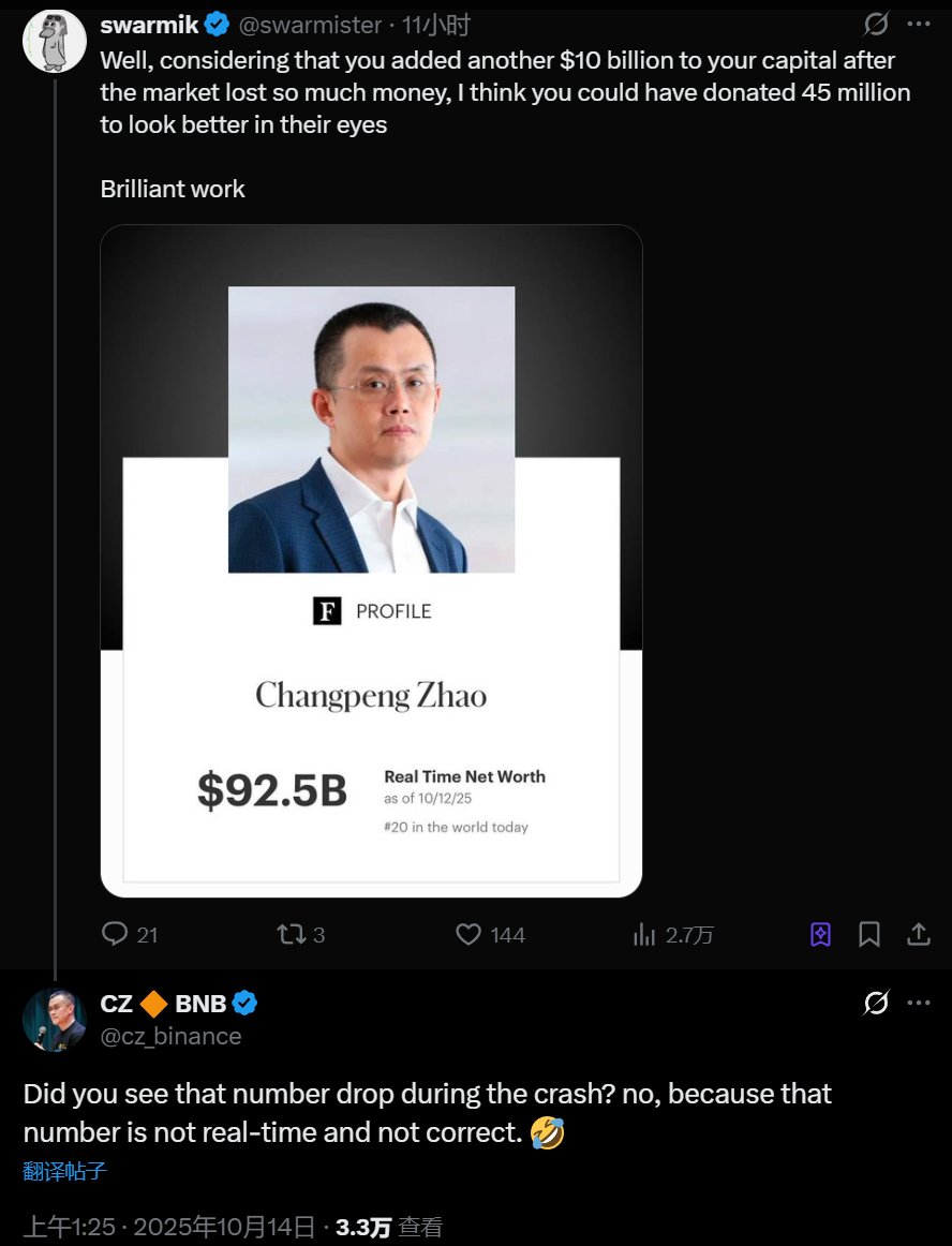 深潮 TechFLOW 消息,10 月 14 日,針對社區關於“福布斯數據顯示 CZ 個人資產在 10.11 閃崩後增加 100 億美元”的討論,CZ 回應稱:“在市場閃崩期間看到福布斯個人資產數據下降了嗎?沒有,因為該數字不是實時的,也不准確。”