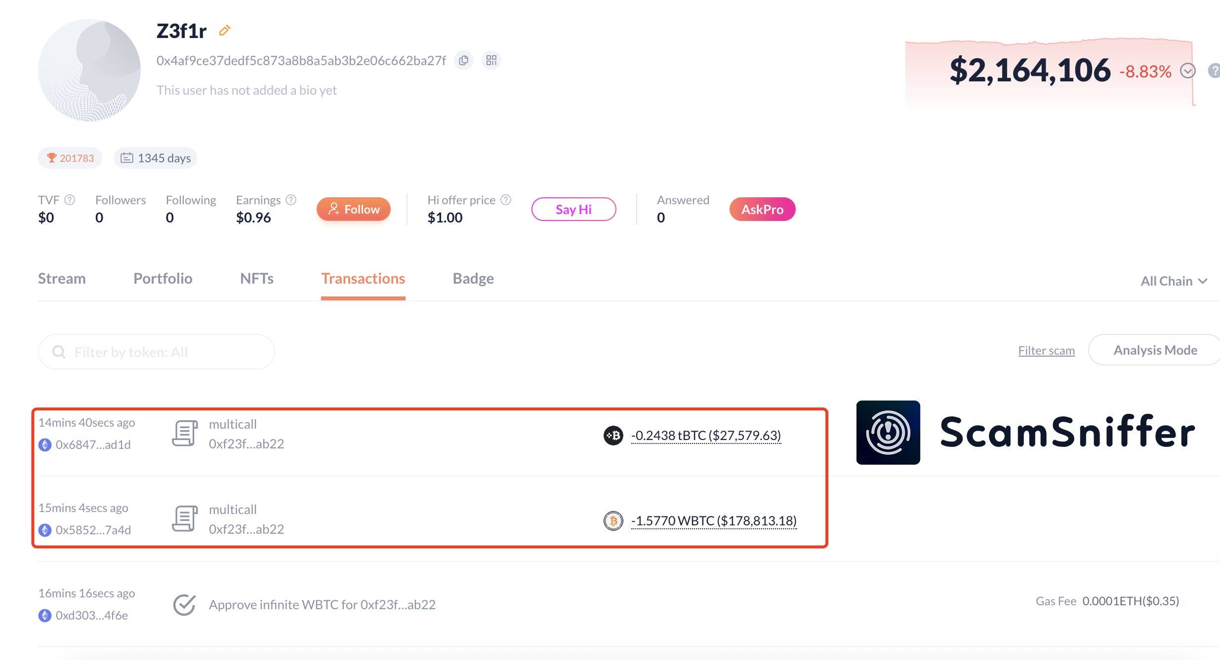 某用戶因簽署惡意授權損失價值 20.98 萬美元的 WBTC 和 tBTC