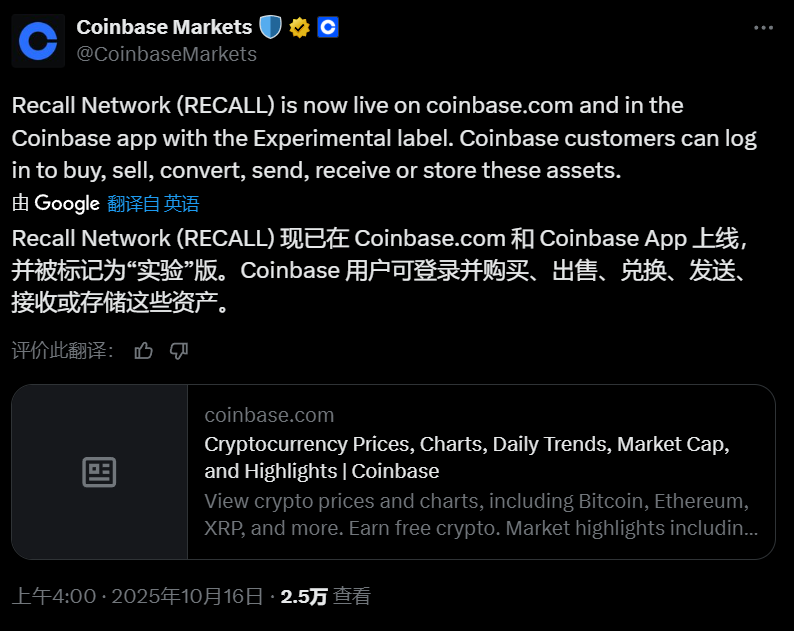Coinbase 今日凌晨宣布已上線Yield Basis(YB)、Recall Network(RECALL)現貨交易