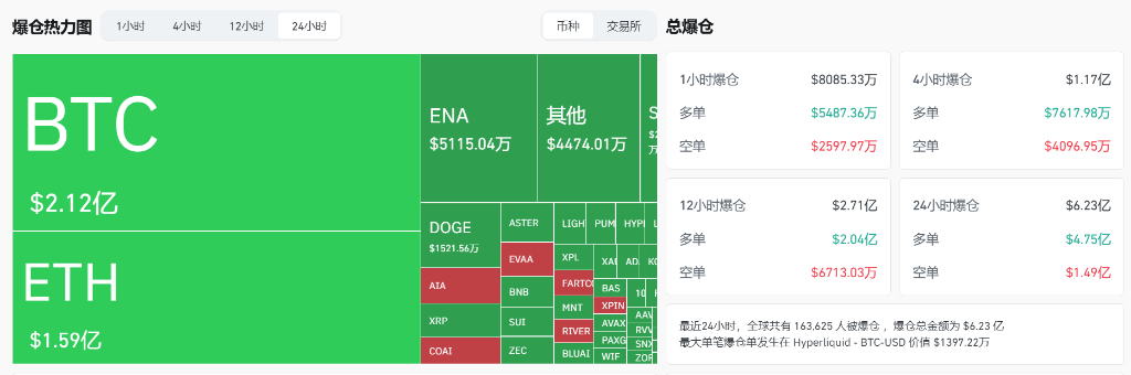 BTC 爆倉金額達 2.12 億美元,ETH 爆倉 1.59 億美元。 過去 24 小時內共有 163,625 人被爆倉,最大單筆爆倉出現在 Hyperliquid 的 BTC-USD 交易對上,價值 1397.22 萬美元。