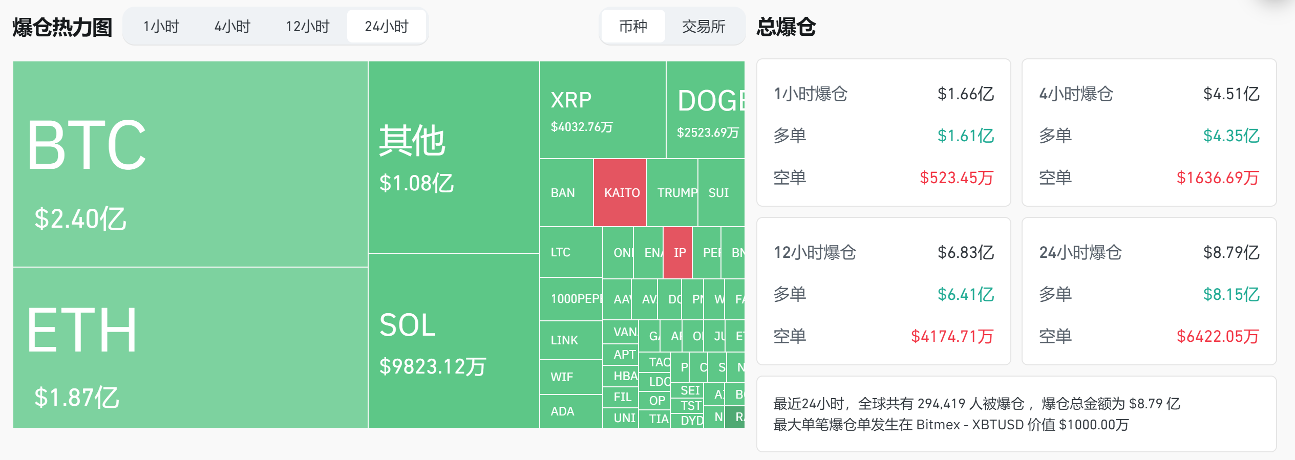 過去 24 小時全網爆倉 8.79 億美元,超 29.4 萬人被爆倉