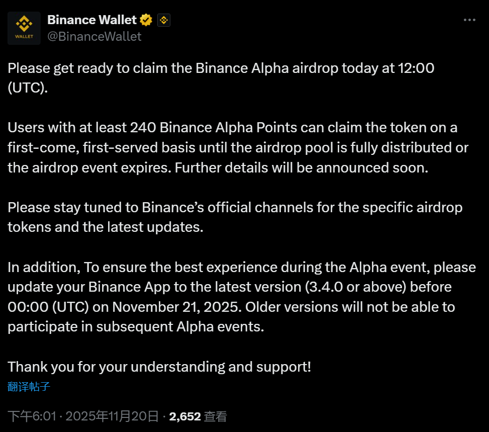 深潮 TechFlow 消息,11 月 20 日,據官方公告,今天 12:00 (UTC) 將開放幣安 Alpha 空投申領。