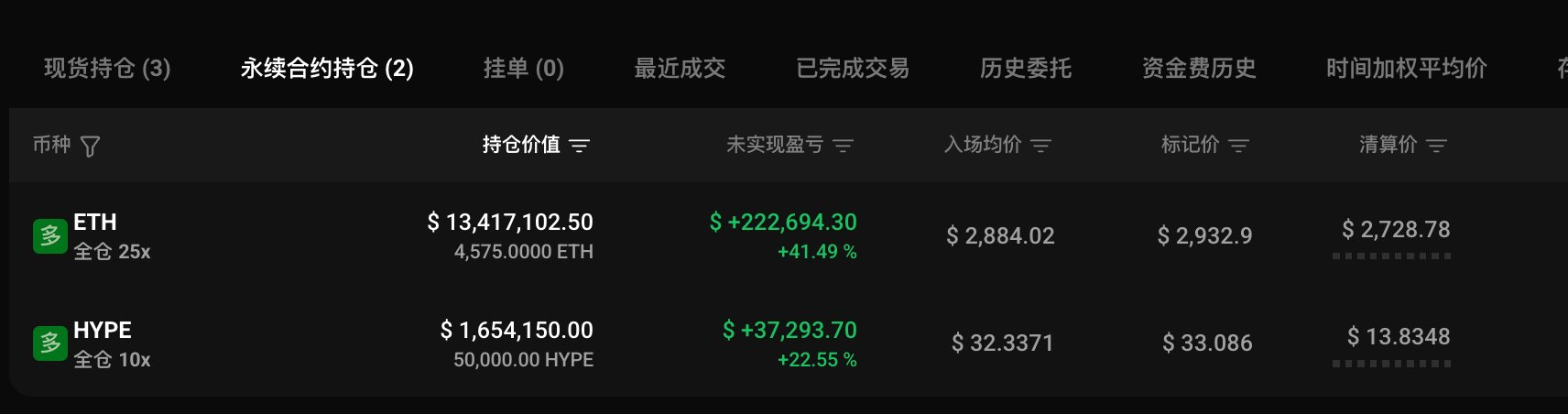 其中,ETH 持倉 4574 枚(價值 1339 萬美元),開倉價為 2884.02 美元;HYPE 持倉 45000 枚(價值 148 萬美元),開倉價為 32.25 美元。