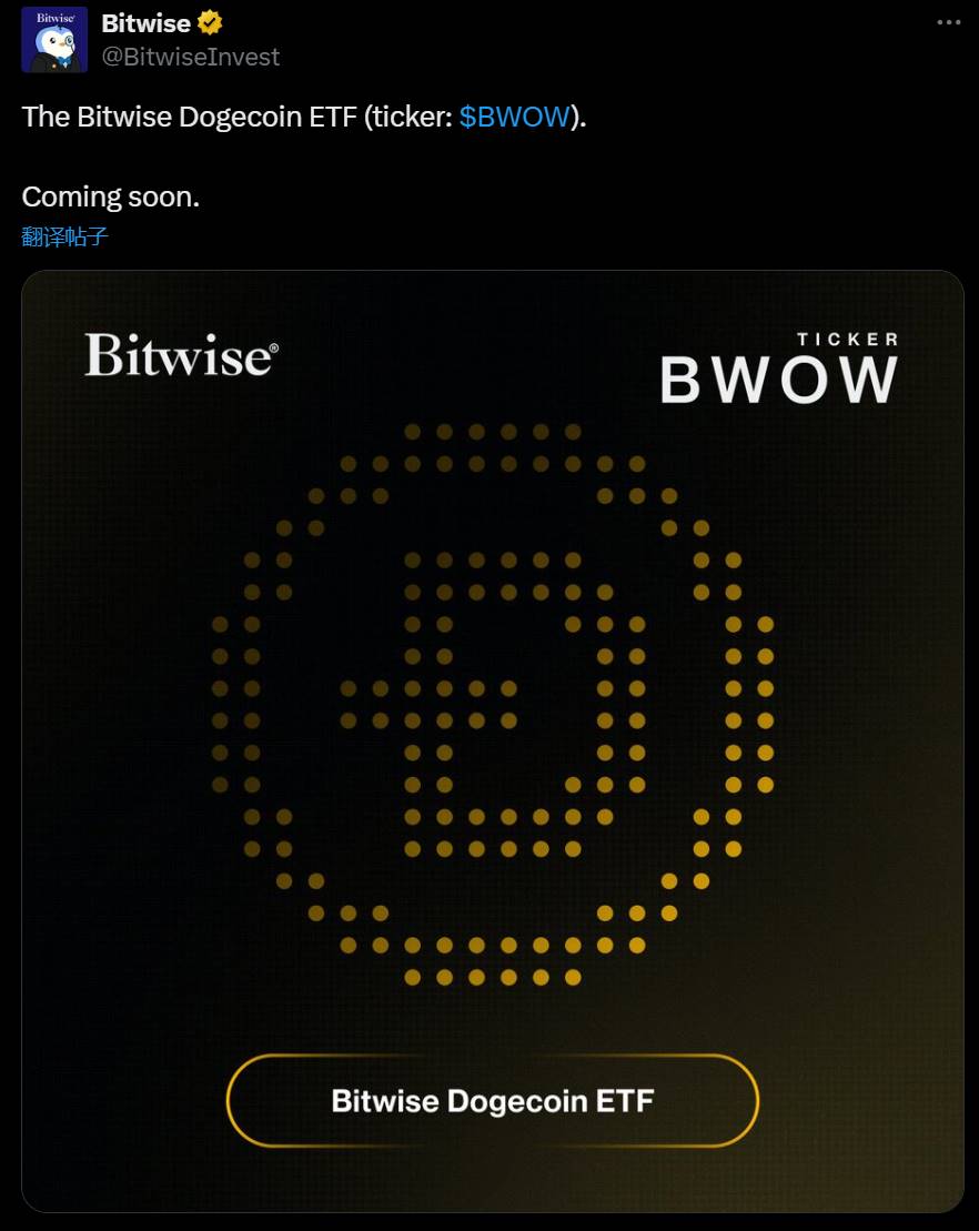 深潮 TechFlow 消息,11 月 25 日,據官方公告,Bitwise旗下狗狗幣(DOGE) ETF 即將推出,交易代碼為 BWOW。